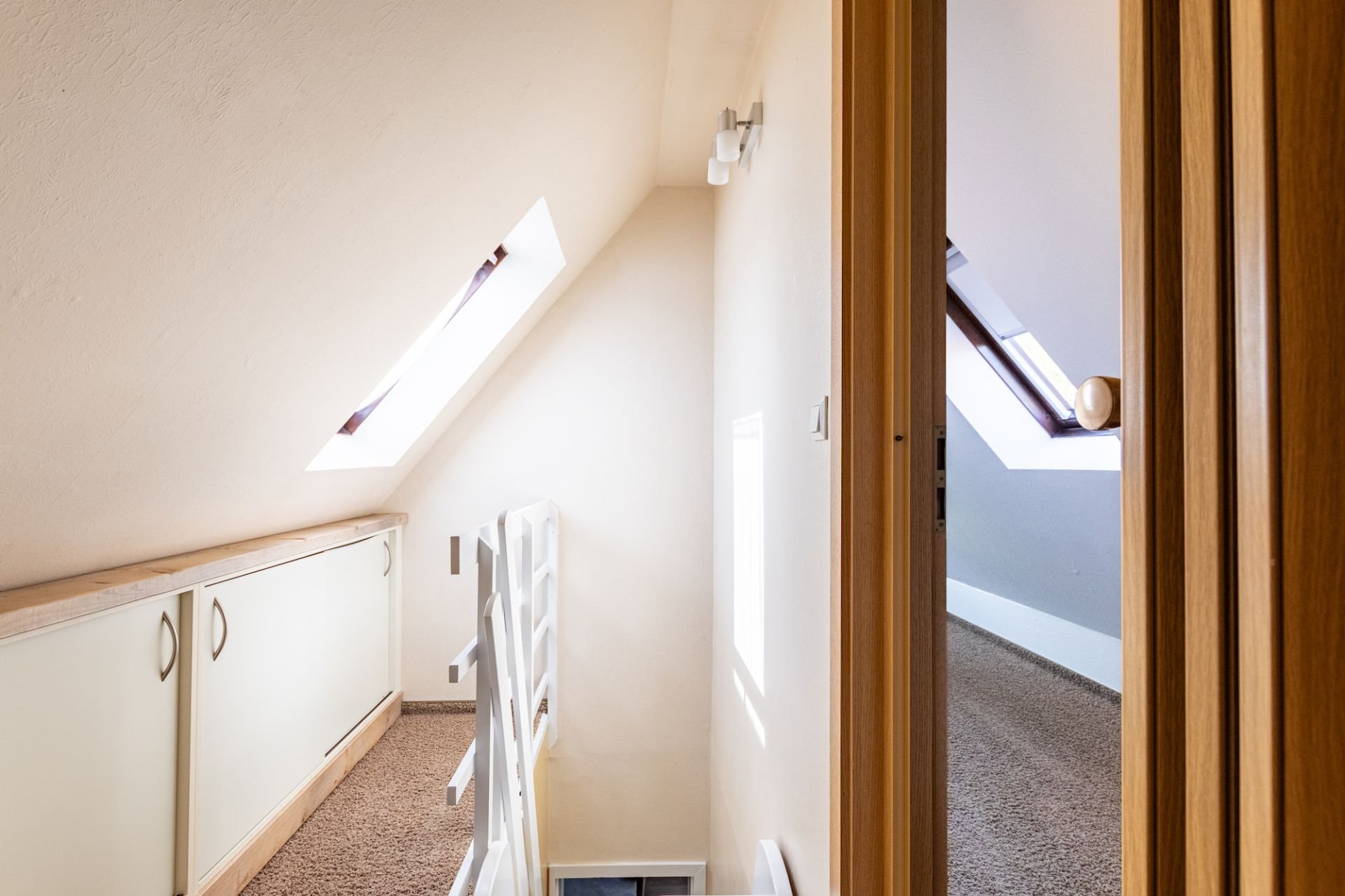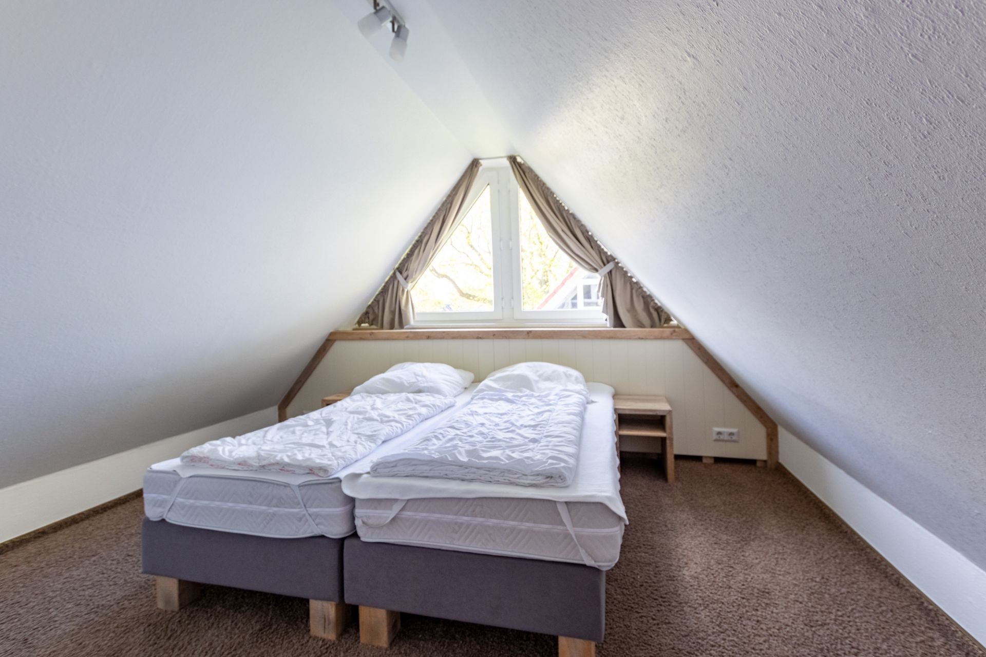Ein weiteres Schlafzimmer befindet sich im ausgebauten Dachgeschoss und ist über eine sehr steile Treppe erreichbar. Dieser besondere Schlafbereich verleiht der Wohnung einen charmanten, individuellen Charakter und eignet sich ideal als zusätzlicher Rückzugsort für Mitreisende oder größere Kinder.