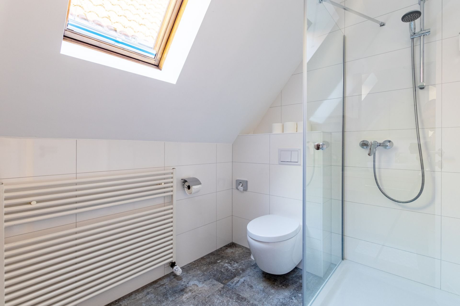 Das moderne Tageslichtbad ist mit Dusche, WC, großzügigem Waschtisch und Föhn ausgestattet.